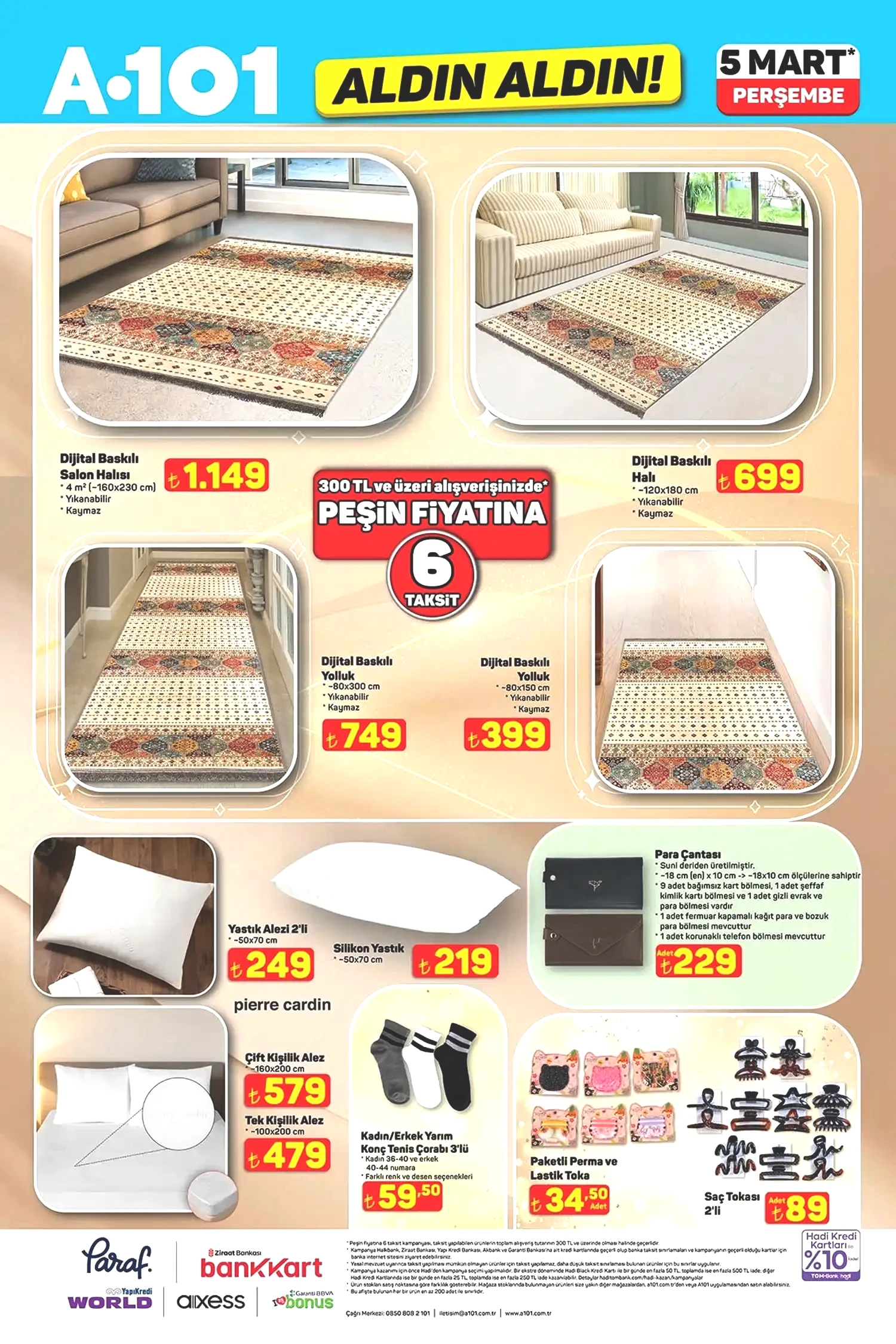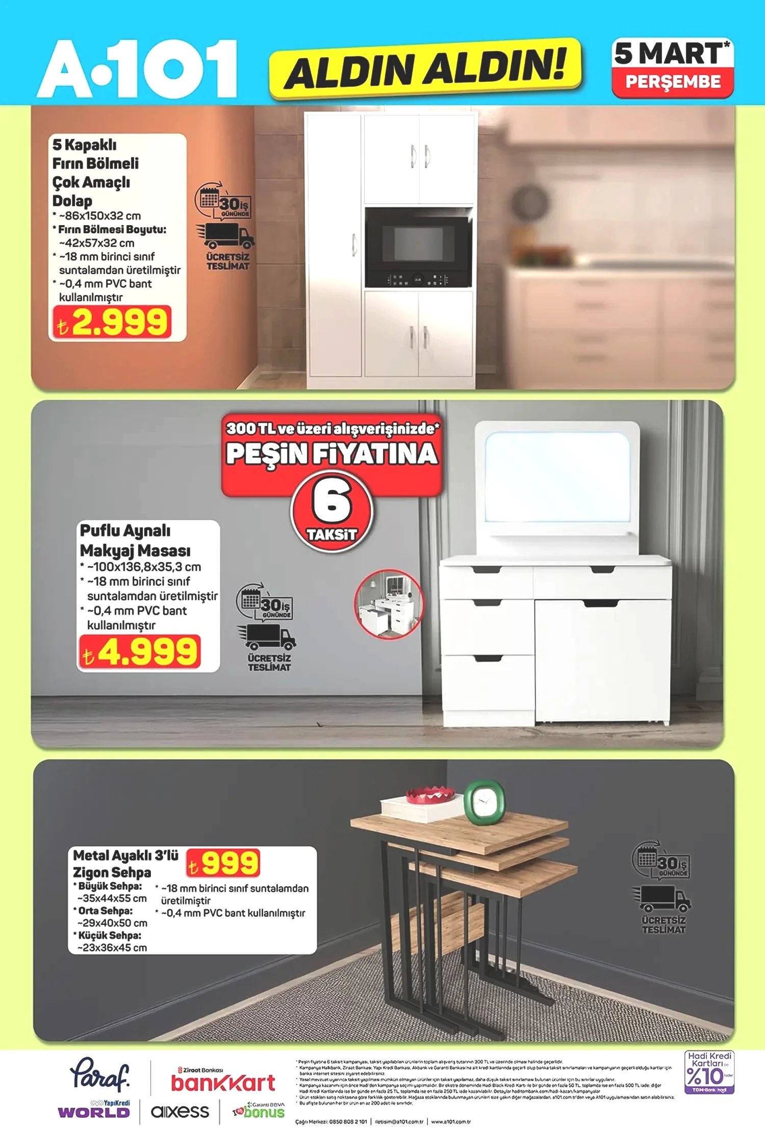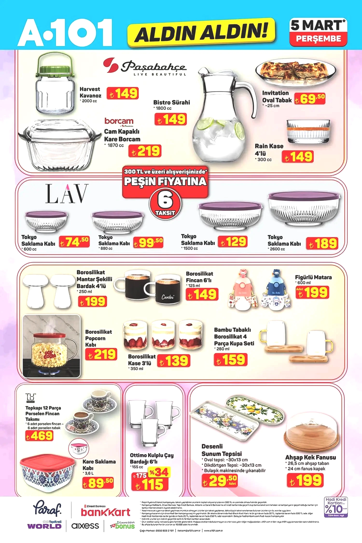5 Mart 2026 A101 kataloğu, şimdiden indirim lovers'ların ilgisini çekmeyi başardı. Mobilya, ev tekstili ve düzenleyiciler kategorilerinde de çeşitli fırsatlar sunulmakta. Mobilya alanında 4,999 TL'ye puf ayaklı bir makyaj masası ve 889 TL fiyatla metal ayaklı zihon sehpa raflarda yer alıyor. Ev Tekstili kategorisinde ise dijital baskılı salon halıları, yolluklar, yastıklar ve alez çeşitleri dikkat çekiyor. Mutfak Züccaciye ürünlerinde Paşabahçe ve LAV markalarına ait şık cam kaseler, bardaklar, saklama kapları ve estetik çelik termoslar da satışa sunulacak. Bunun yanı sıra, oyuncaklar, mopedler ve birçok çeşitli farklı ürün A101 mağazalarında yer bulmuş durumda. 5 Mart A101 kataloğunda hayvan dostlarımız da göz ardı edilmemiş. Felix ve Enjoy markalarının kedi ve köpek mamaları indirimli fiyatlarla sunulurken, Proline kedi kumu, otomatik su şelalesi, mama kapları ve evcil hayvan taşıma/bakım aksesuarları da kampanyaya katılmış. Bu ürünler piyasa fiyatına göre oldukça uygun seviyelerden satılmakta. Dilerseniz indirimleri değerlendirebilirsiniz. Daha birçok özellik ve kampanyalar için incelemelerinizi sürdürmenizi öneririz. Şimdi sizlere 5 Mart A101 kataloğu ile baş başa bırakabiliriz!