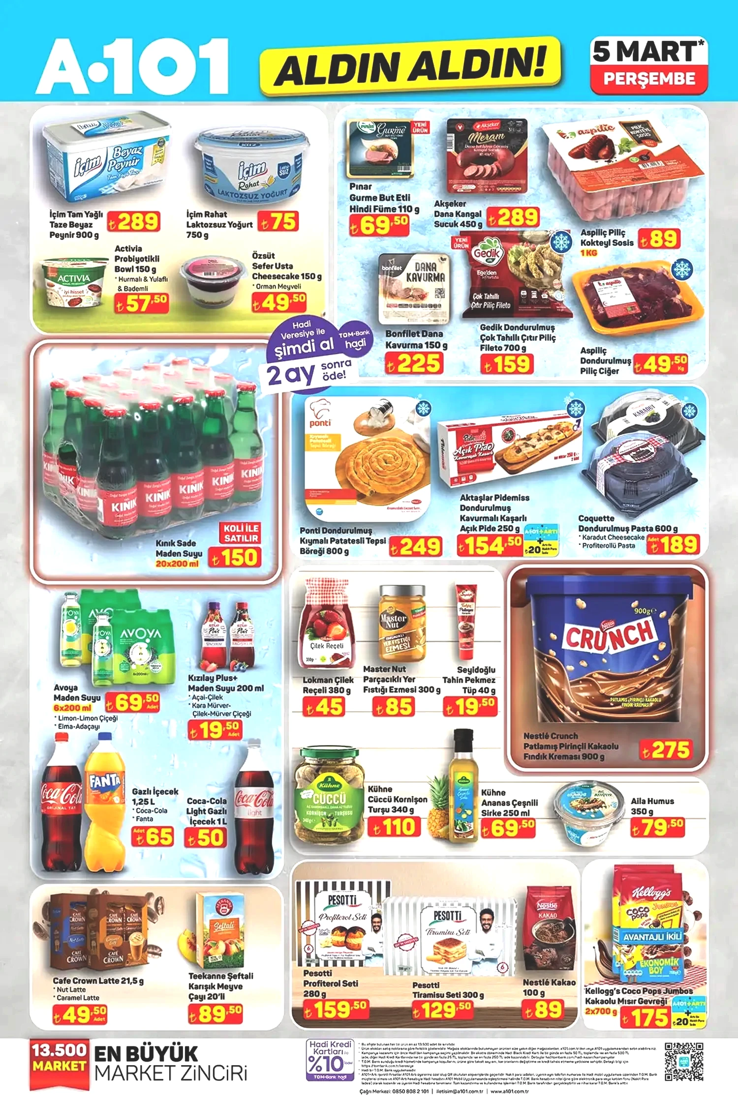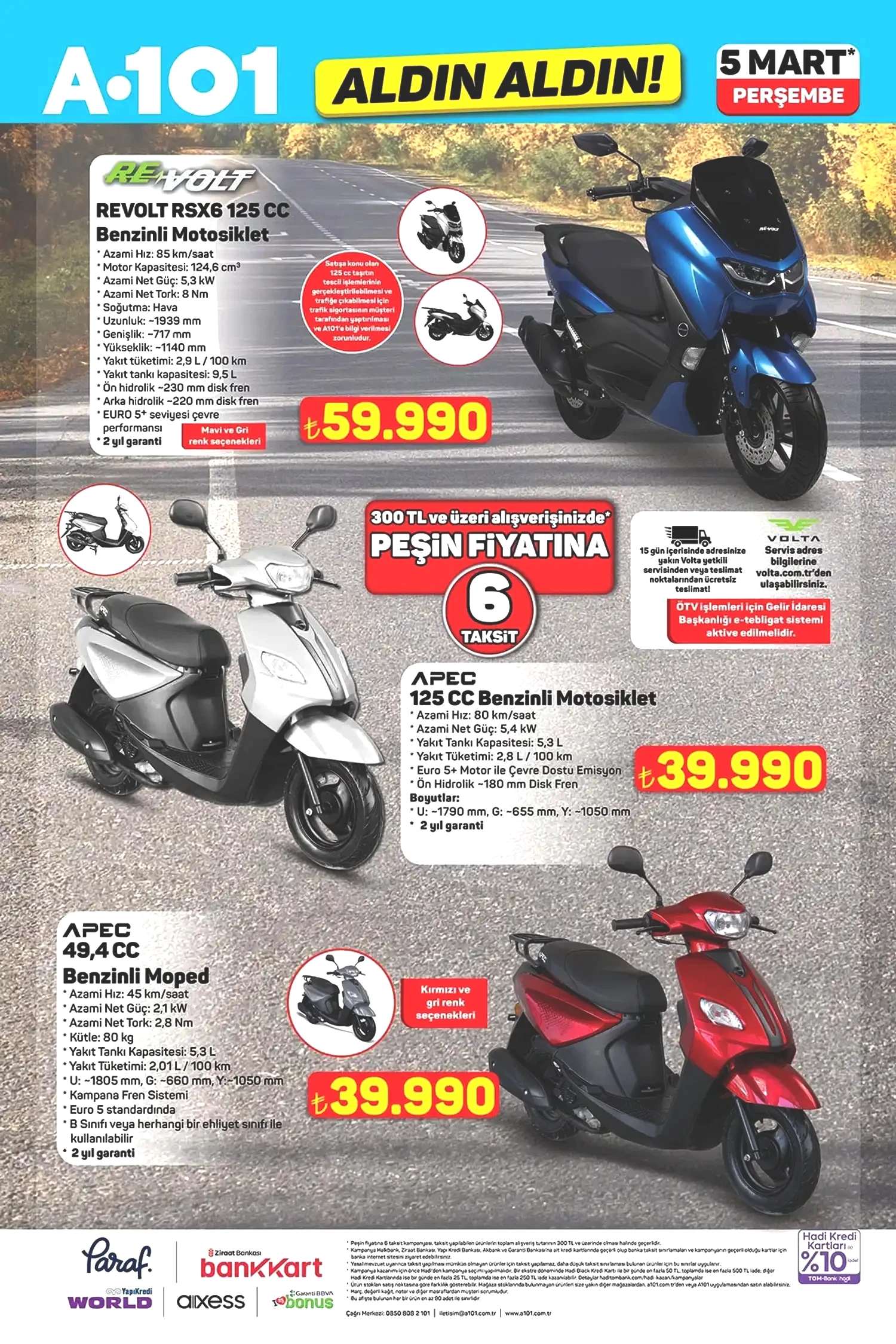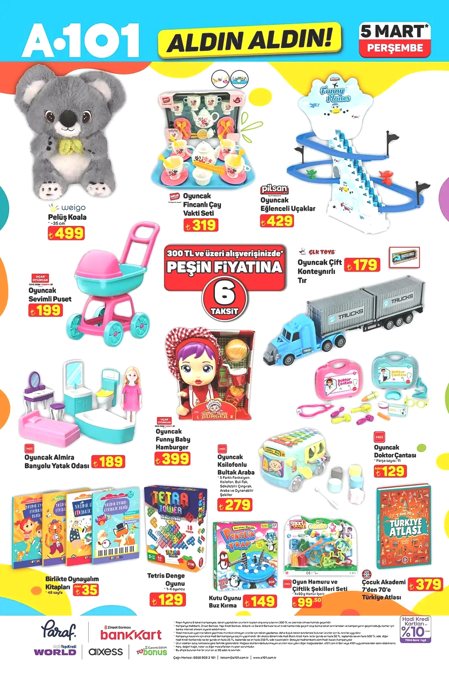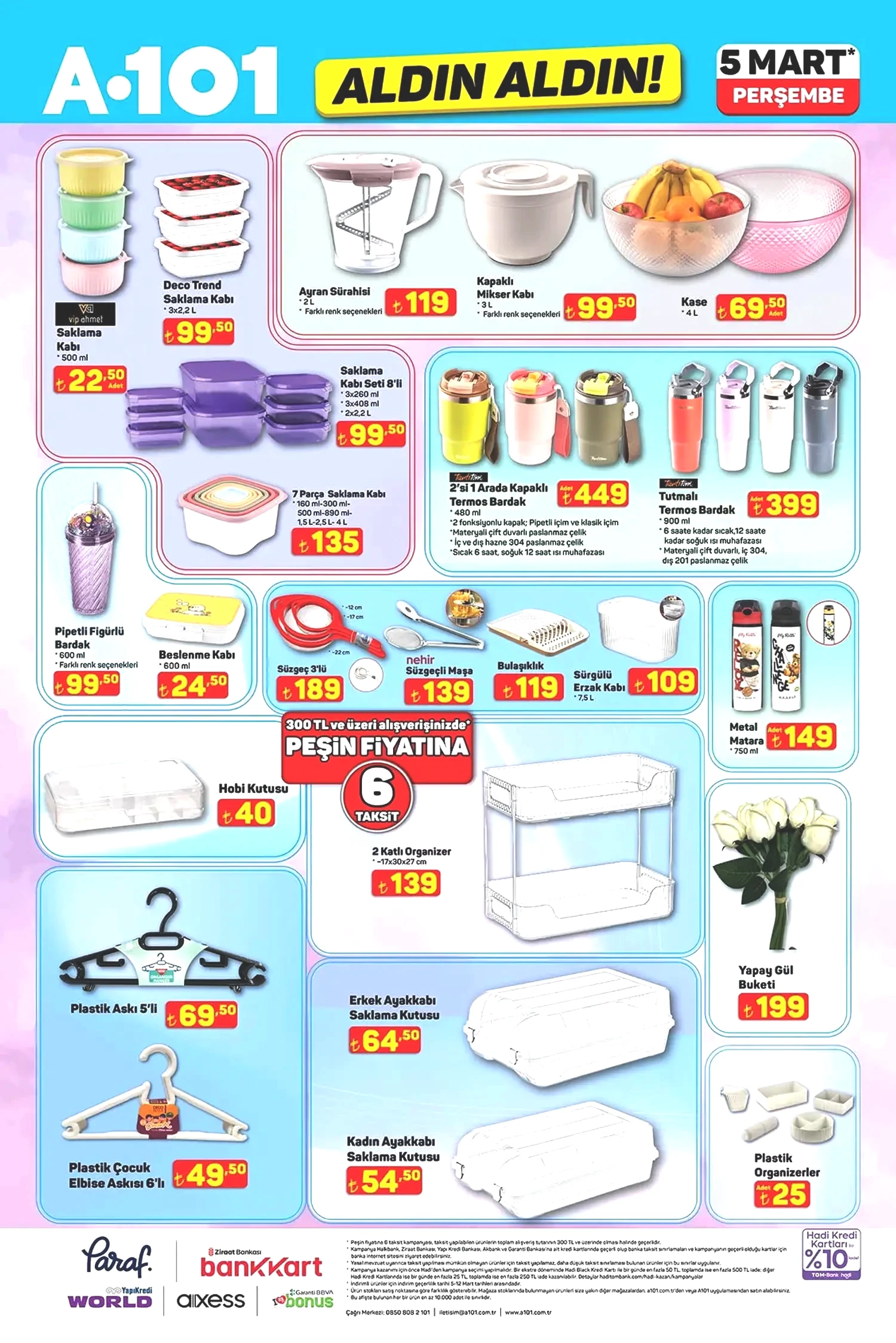 5 Mart 2026 A101 kataloğu, şimdiden indirim lovers'ların ilgisini çekmeyi başardı. Mobilya, ev tekstili ve düzenleyiciler kategorilerinde de çeşitli fırsatlar sunulmakta. Mobilya alanında 4,999 TL'ye puf ayaklı bir makyaj masası ve 889 TL fiyatla metal ayaklı zihon sehpa raflarda yer alıyor. Ev Tekstili kategorisinde ise dijital baskılı salon halıları, yolluklar, yastıklar ve alez çeşitleri dikkat çekiyor. Mutfak Züccaciye ürünlerinde Paşabahçe ve LAV markalarına ait şık cam kaseler, bardaklar, saklama kapları ve estetik çelik termoslar da satışa sunulacak. Bunun yanı sıra, oyuncaklar, mopedler ve birçok çeşitli farklı ürün A101 mağazalarında yer bulmuş durumda. 5 Mart A101 kataloğunda hayvan dostlarımız da göz ardı edilmemiş. Felix ve Enjoy markalarının kedi ve köpek mamaları indirimli fiyatlarla sunulurken, Proline kedi kumu, otomatik su şelalesi, mama kapları ve evcil hayvan taşıma/bakım aksesuarları da kampanyaya katılmış. Bu ürünler piyasa fiyatına göre oldukça uygun seviyelerden satılmakta. Dilerseniz indirimleri değerlendirebilirsiniz. Daha birçok özellik ve kampanyalar için incelemelerinizi sürdürmenizi öneririz. Şimdi sizlere 5 Mart A101 kataloğu ile baş başa bırakabiliriz!