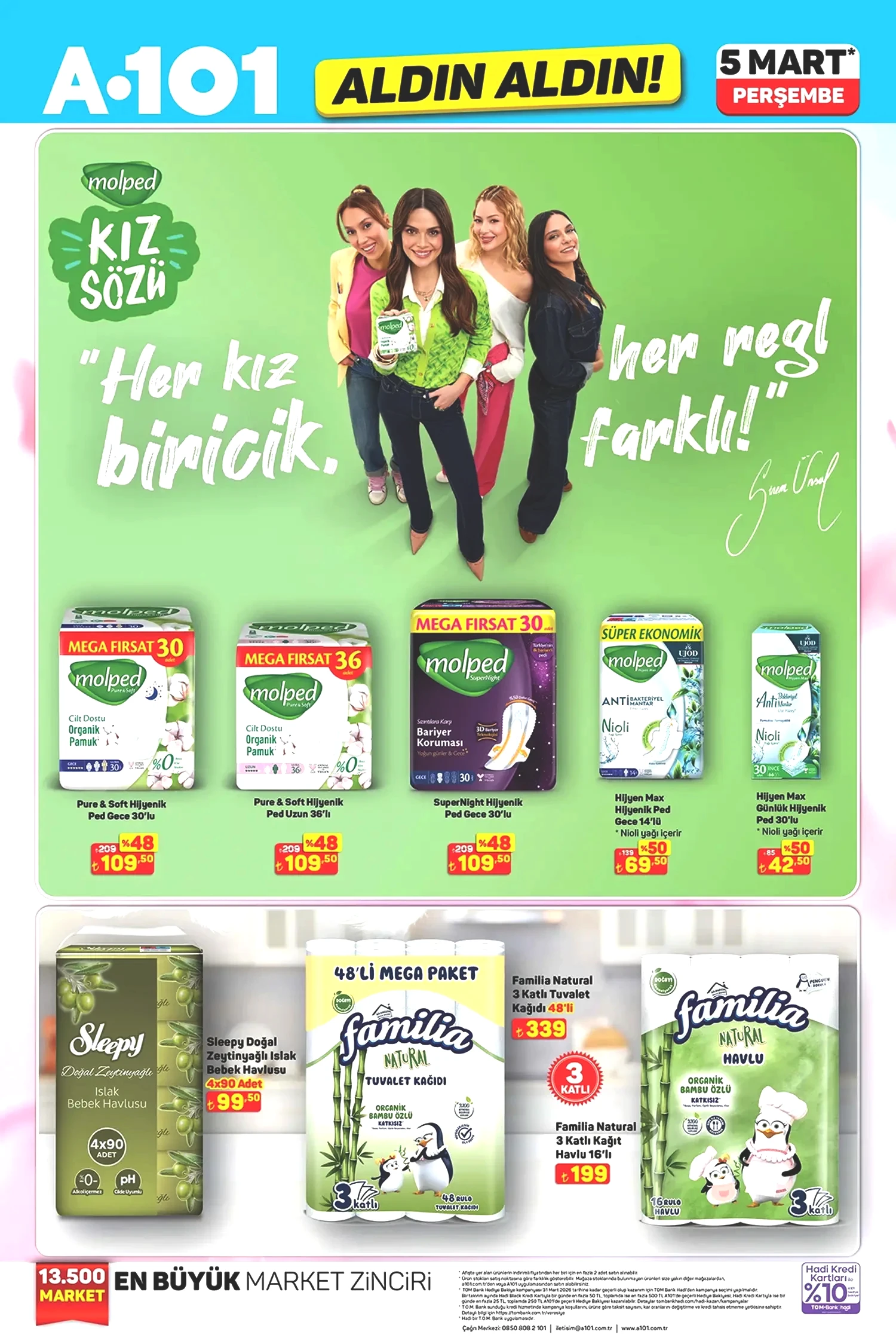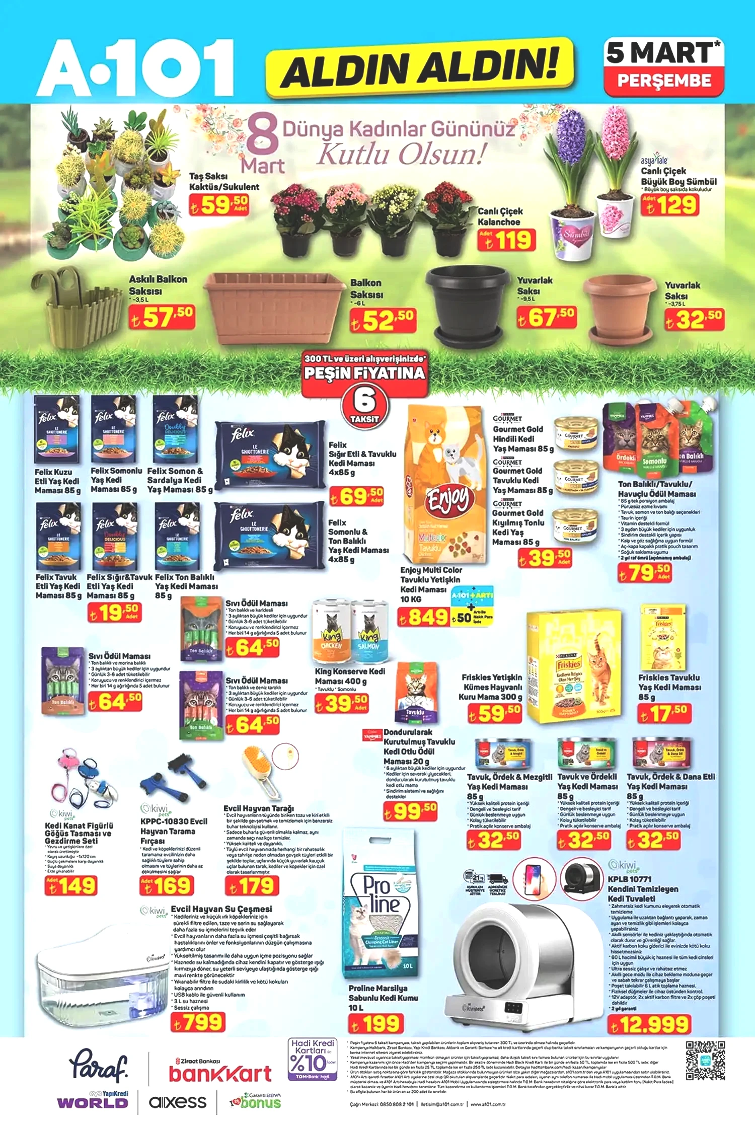 A101 Aktüel kataloğu, 5 Mart 2026 indirimleri ile birlikte 8 Mart Dünya Kadınlar Günü'nü de unutmuyor. Dünya Emekçi Kadınlar Günü'nde hediye alternatifleri market raflarını süslüyor. Kişisel bakım ürünlerinde mevcut fırsatlar dikkat çekiyor. Kozmetik ve Bakım kategorisinde Maybelline maskara ve göz kalemleri, Garnier cilt bakım serumları, micellar sular ve maskeler uygun fiyatlarla satışa sunuluyor. Canlı çiçekler de indirimli! Kadınlar Günü’nün vazgeçilmez hediyesi olan saksı çiçekleri ve yapay gül buketleri, kadınlarımıza anlamlı hediyeler sunmanın en güzel yolu olarak öne çıkıyor. Ayrıca hijyen ürünleri de uygun fiyatlarla alıcılarını bekliyor. Molped ped çeşitleri, Sleepy ıslak havlular ve Familia tuvalet kağıtları da indirimli fiyatlarla raflardaki yerini alacak.
