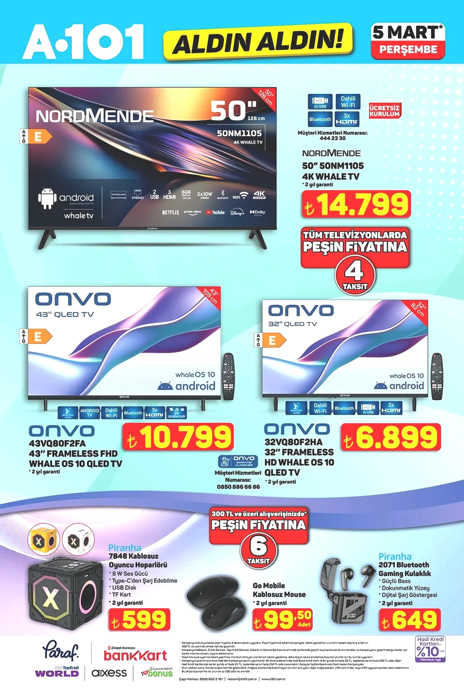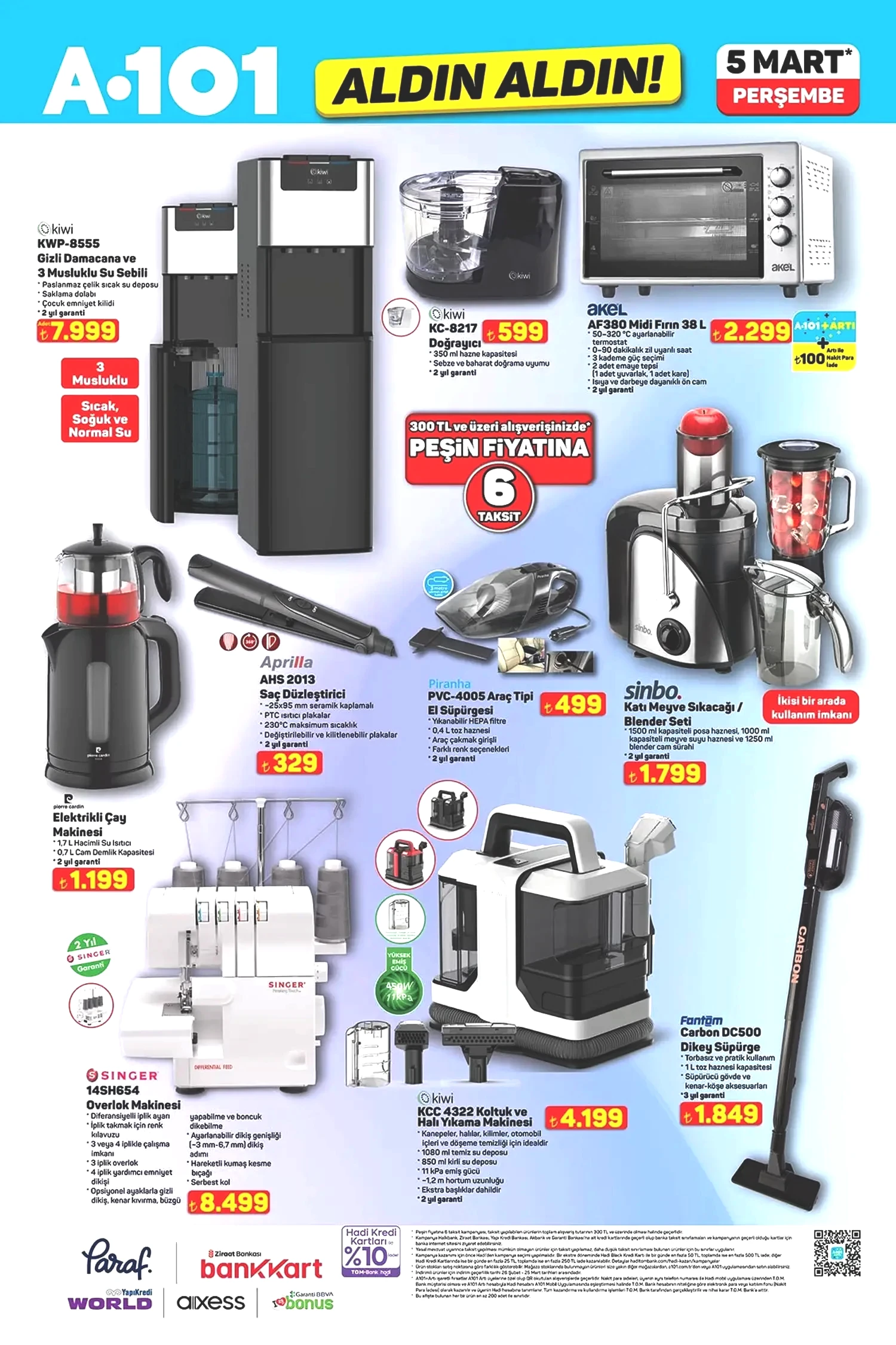 5 Mart 2026 Perşembe gününden itibaren geçerli olacak olan A101 indirimleri, raflarda stok bulundukça sürecek. Bu hafta indirimli ürünler arasında elektronik aletler ve televizyonlar öne çıkıyor. TV izleme keyfini artıracak büyük ekran televizyonlar ve çevre birimleri mevcuttur. Nordmende ve Onvo markası altında 50 inç, 43 inç ve 32 inç seçenekleriyle sunulan akıllı televizyonların fiyatları sırasıyla 14,799 TL, 10,799 TL ve 6,899 TL olarak belirlenmiş. Ürünler, ekran ve panel kaliteleri ile dikkat çekiyor. Ayrıca sayfada Piranha kablosuz oyuncu hoparlörü, Bluetooth kulaklık ve kablosuz mouse gibi uygun fiyatlı teknolojik aksesuarlar yer almakta. Özellikle 599 TL fiyatıyla satılan Piranha 7848 kablosuz oyuncu hoparlörü, şık tasarımı ile göz dolduruyor. A101 5 Mart 2026 kataloğundaki diğer bir sayfada ev aletleri oldukça çeşitli. Dikişle uğraşanlar için dikkat çeken ürünlerden biri, 8,499 TL fiyatıyla Singer Overlok Makinesi. Fantom dikey süpürgenin fiyatı ise 1,849 TL'den başlarken, Kiwi koltuk ve halı yıkama makinesi de 4,199 TL'den temizlik ihtiyaçlarınıza katkı sağlamak üzere raflarda yerini alıyor. Mutfak elektroniği alanında da indirim mevcut; Akel midi fırın 2,299 TL, Kiwi su sebili 7,999 TL, Sinbo katı meyve sıkacağı 1,799 TL ve çay makinesi 1,199 TL olarak mutfakların vazgeçilmezleri arasında bulunuyor.