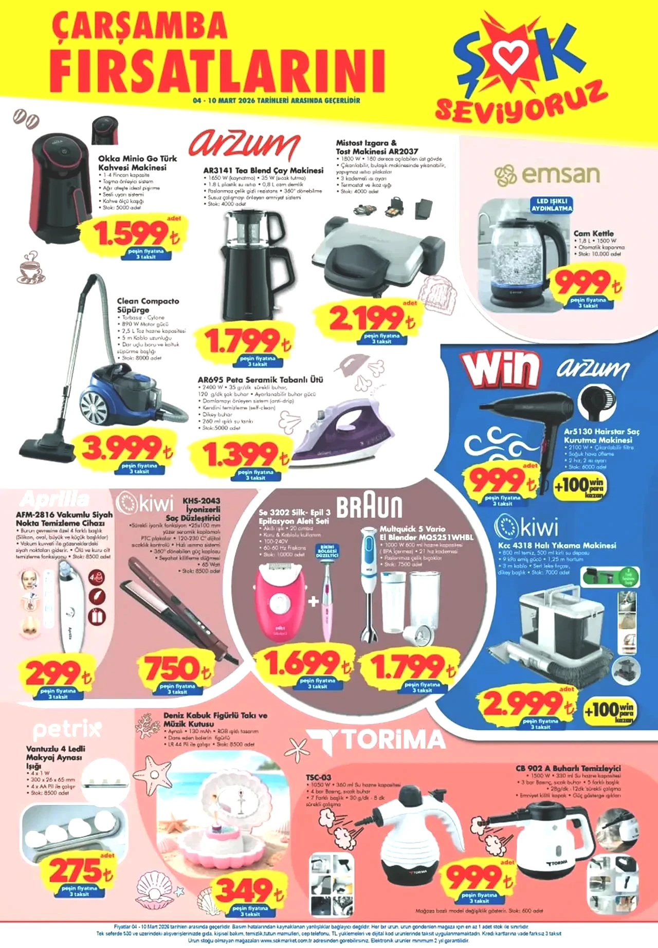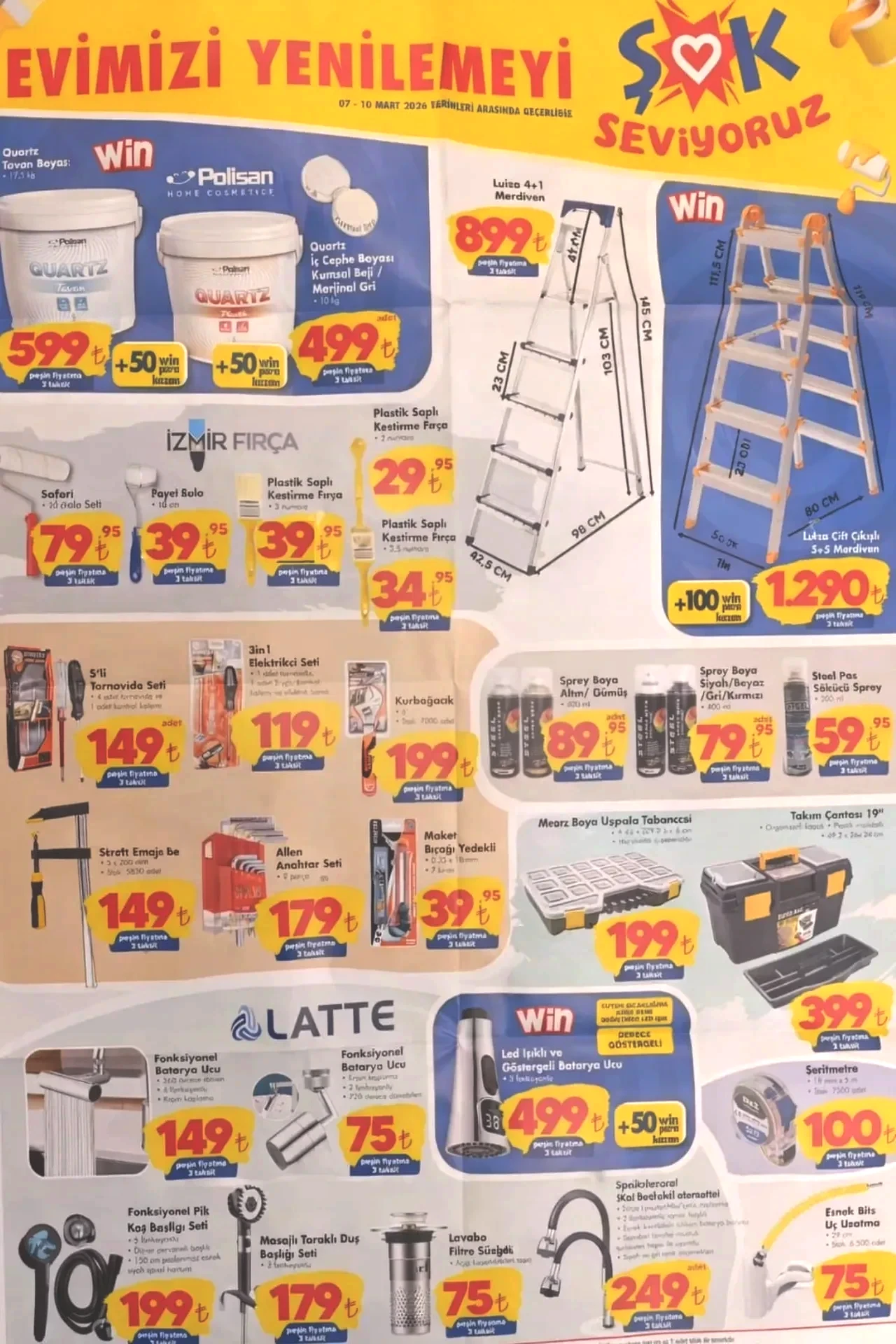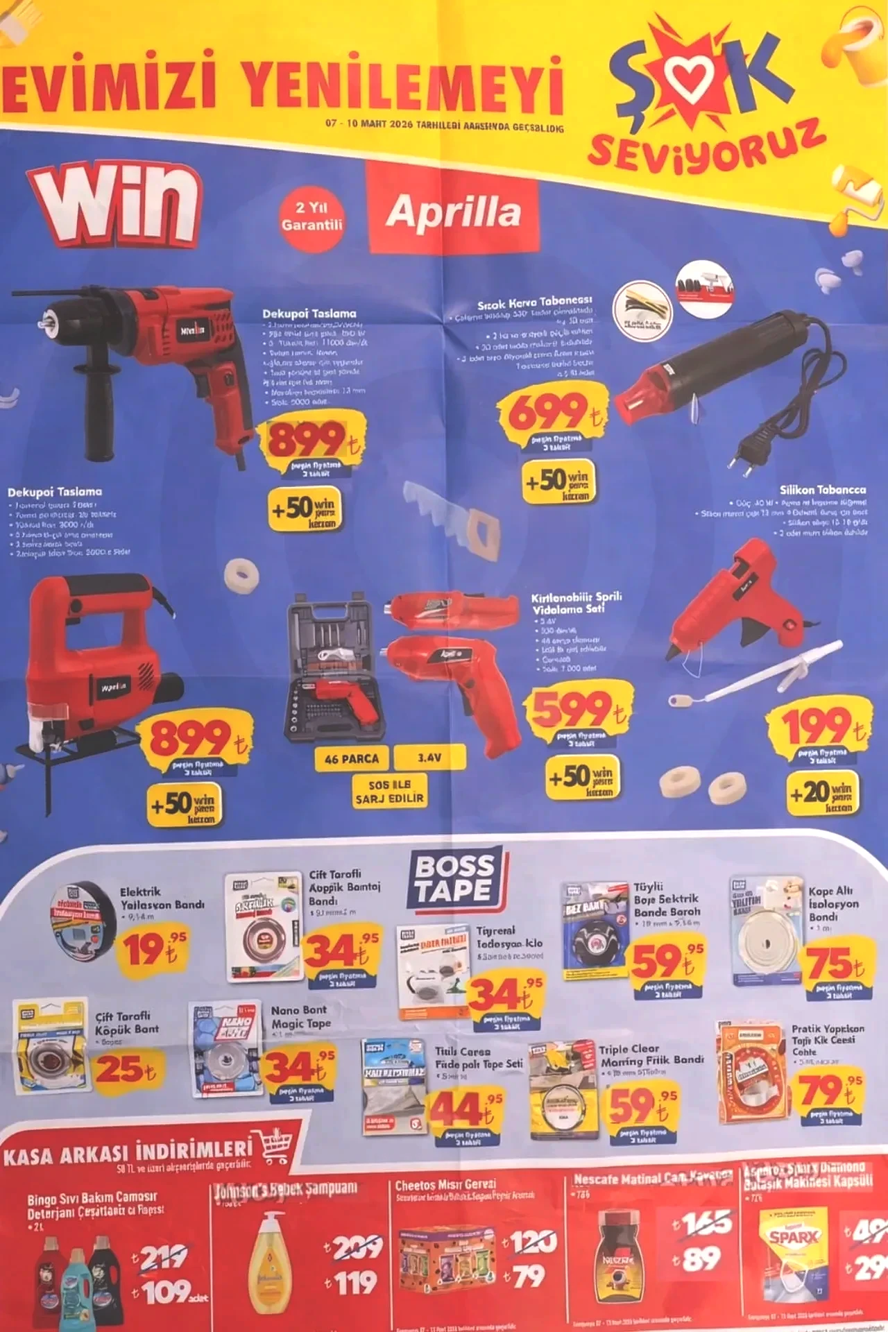ŞOK marketleri 7-10 Mart tarihleri arasında geçerli aktüel ürünler kataloğunda banyo malzemeleri, merdivenler, çeşitli boya türleri ve ev tadilatında kullanılabilecek malzemeler ön plana çıkıyor. Bu hafta sunulan indirimli ürünler, 10 Mart’a kadar raflarda yer alacak. Kahve makineleri, çay makineleri, cam kettle'lar, elektrikli süpürgeler, seramik tabanlı ütüler, saç kurutma makineleri, saç düzleştiricileri, fincan setleri, tencere ve tava çeşitleri, temizlik ürünleri gibi birçok kategoride cazip fiyatlar ve kampanyalar tüketicileri bekliyor. Örneğin, seramik tabanlı ütü 1.399 TL, cam kettle 999 TL, halı yıkama makinesi 2.999 TL, makyaj aynası ışığı 275 TL, porselen kahve fincan takımı 499 TL, bambu kesme tahtası ve renkli sürahi 129 TL, kadın omuz çantası 299 TL, kapaklı organizer çanta büyük boy 239 TL, ve kadın pijama takımı 499 TL fiyat etiketiyle satışta. İşte, ŞOK’un 7-10 Mart tarihli aktüel ürün kataloğunda öne çıkan ürünler...